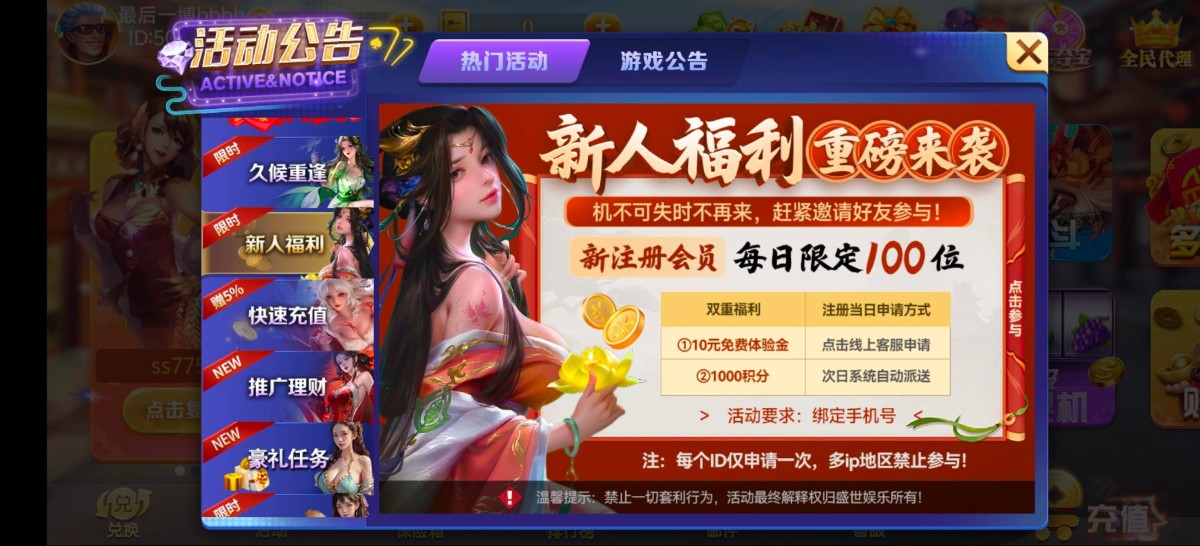 每天限定前100位申请,跟新盛世一样。还是10元可以去打通比牛牛,打上20就玩炸金花,如果低于10金币就去打捕鱼,依次循环。还是很容易赢,我打到120没提输完了