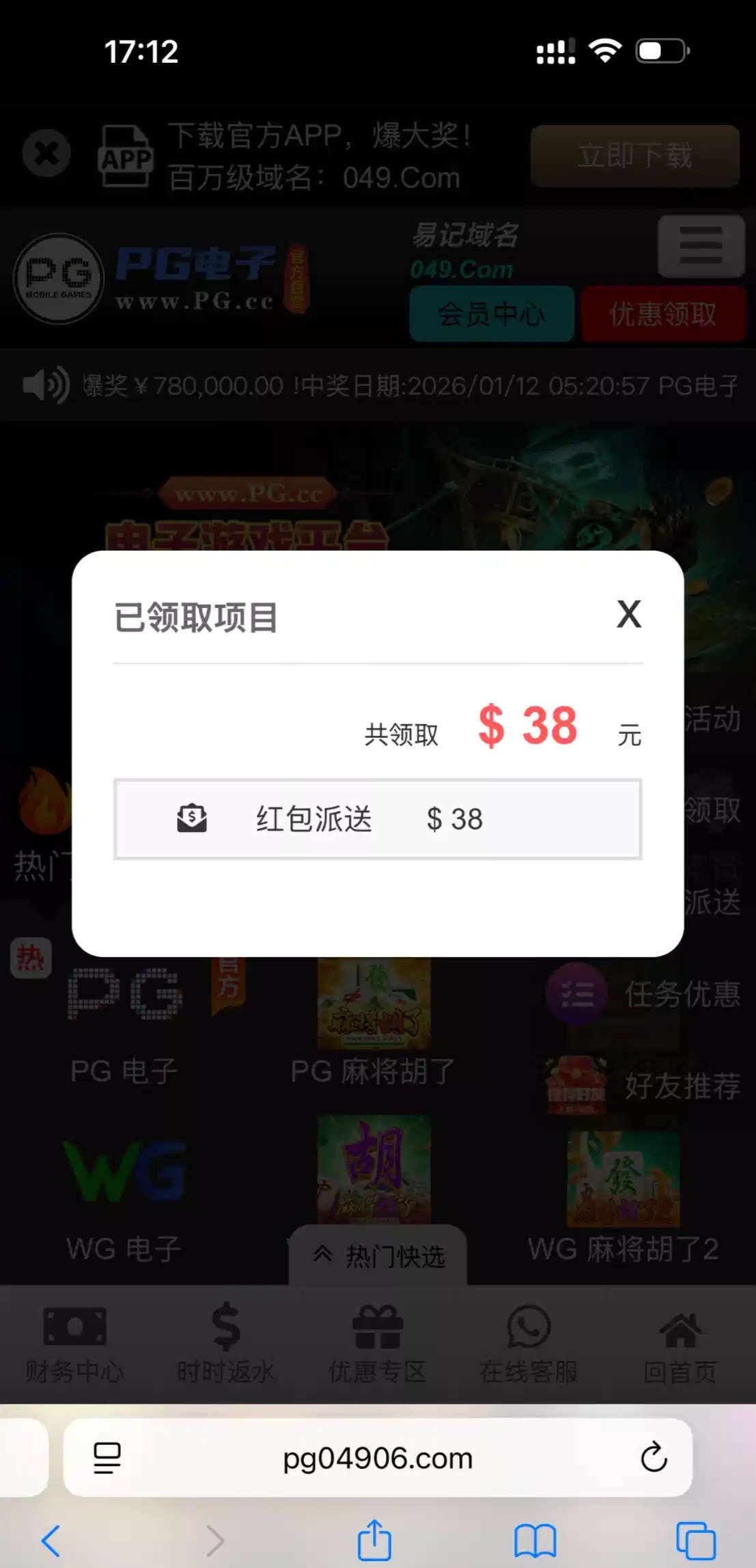 登录上就会弹一个小红包送38